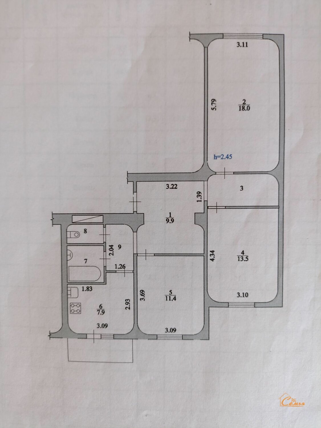 жилая площадь 42,9 кв.м (18; 13,5; 11,4)